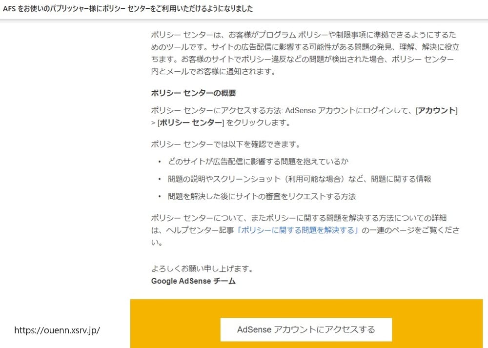 Google AdSense のAFS(検索向け AdSense)に関する重要なお知らせが届きました。このメールには、ポリシーセンターの活用方法や重要な手順についての情報が含まれていますここでは、このメールの内容と対処方法について詳しく解説します。